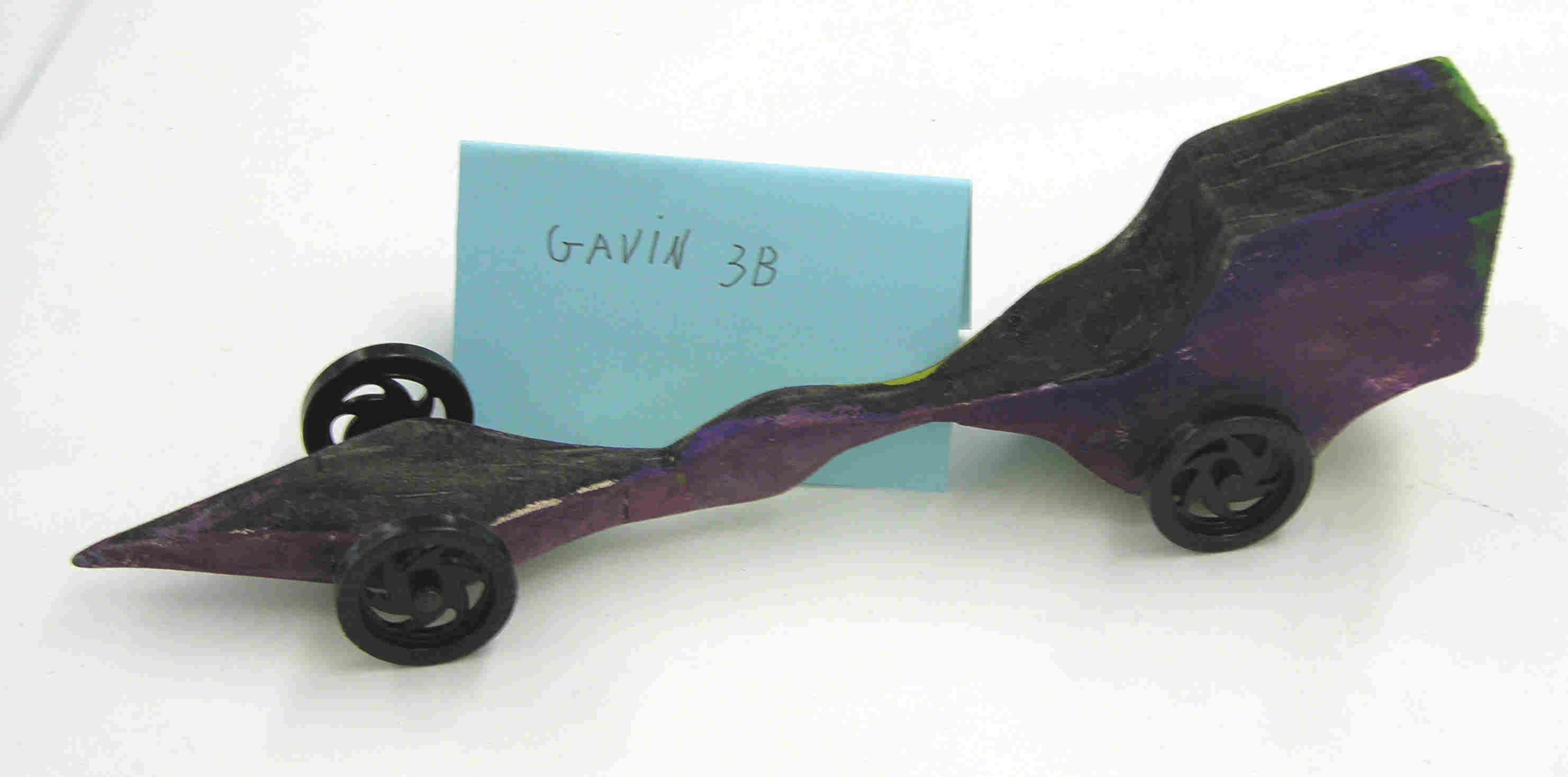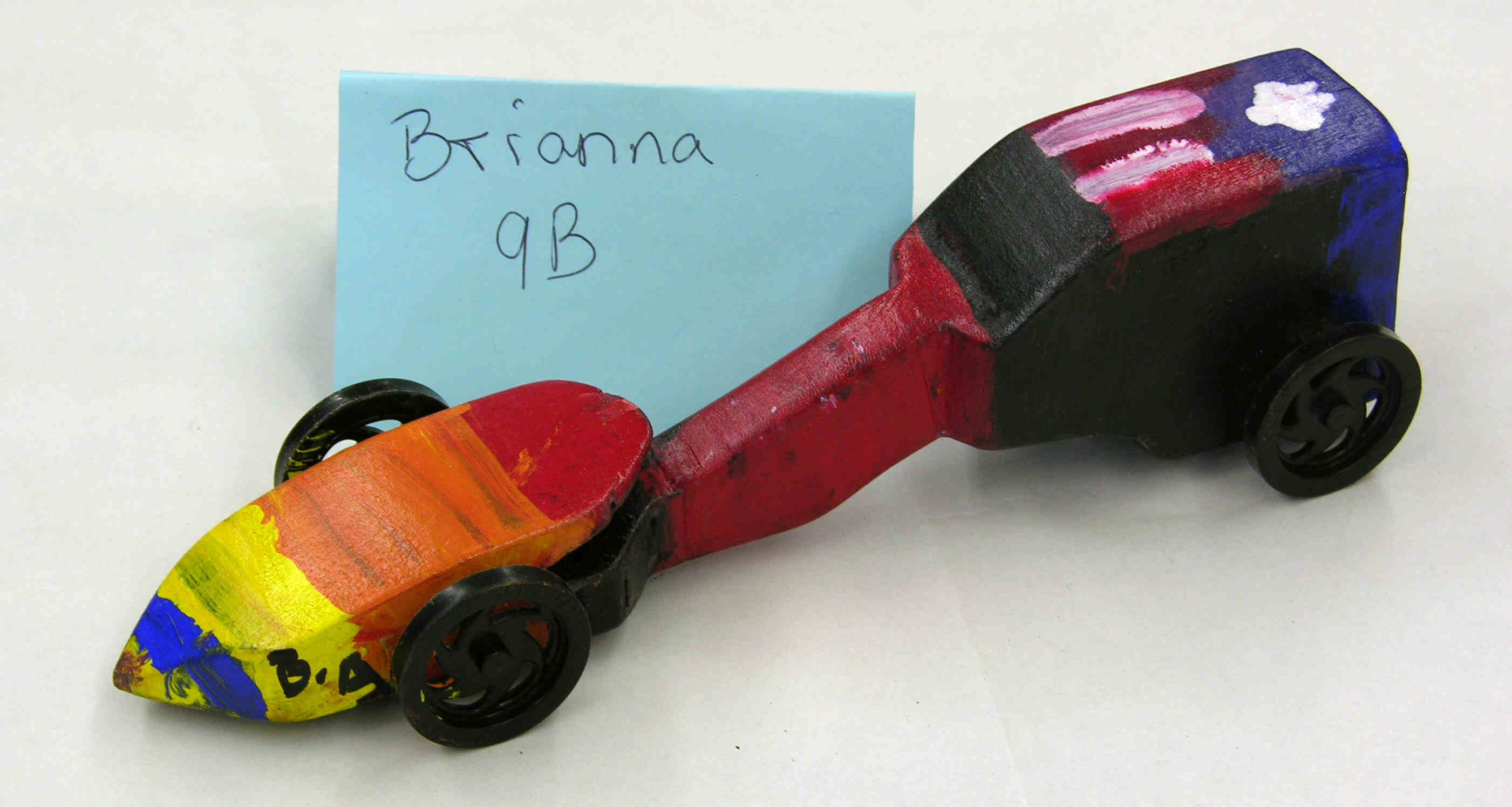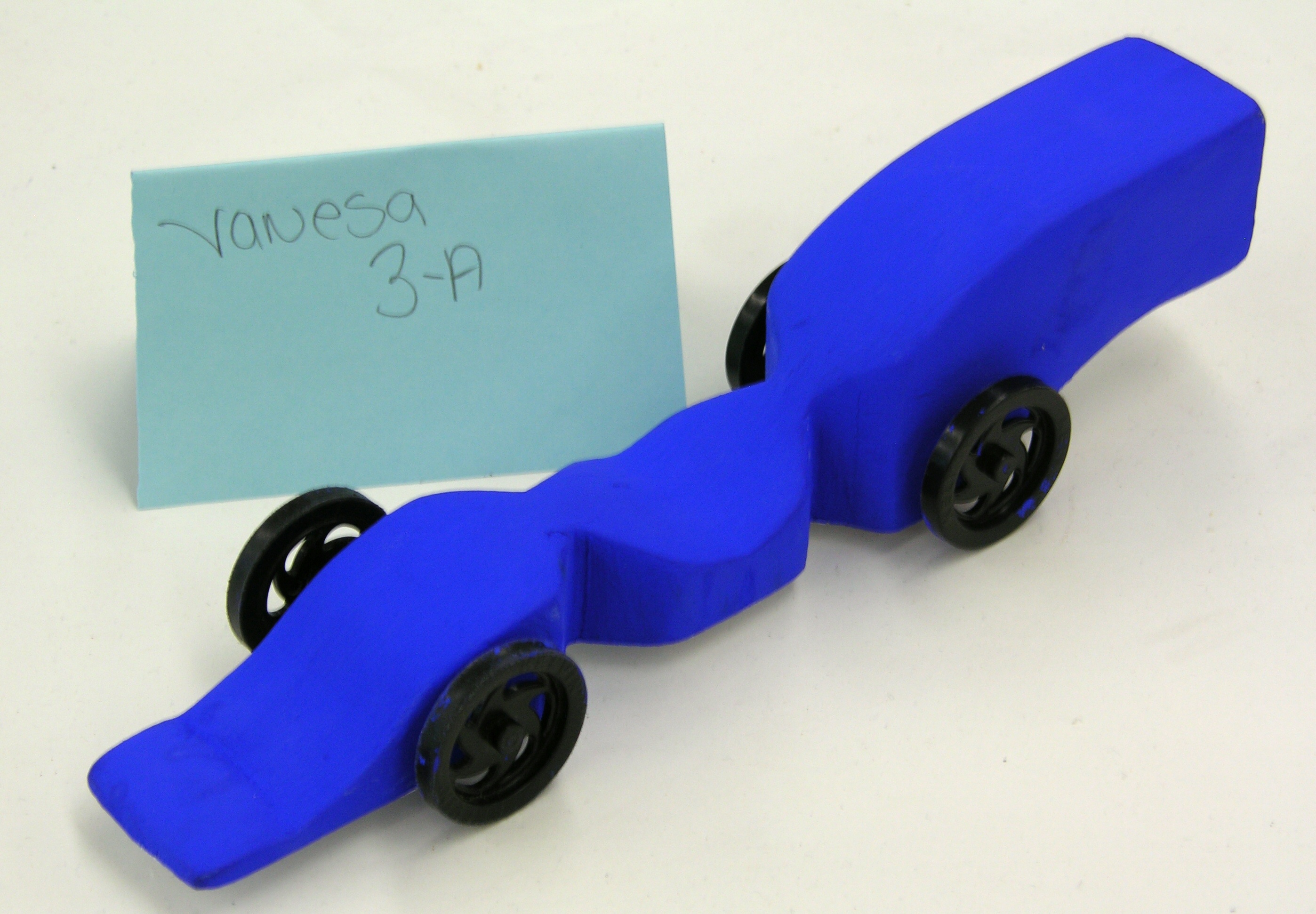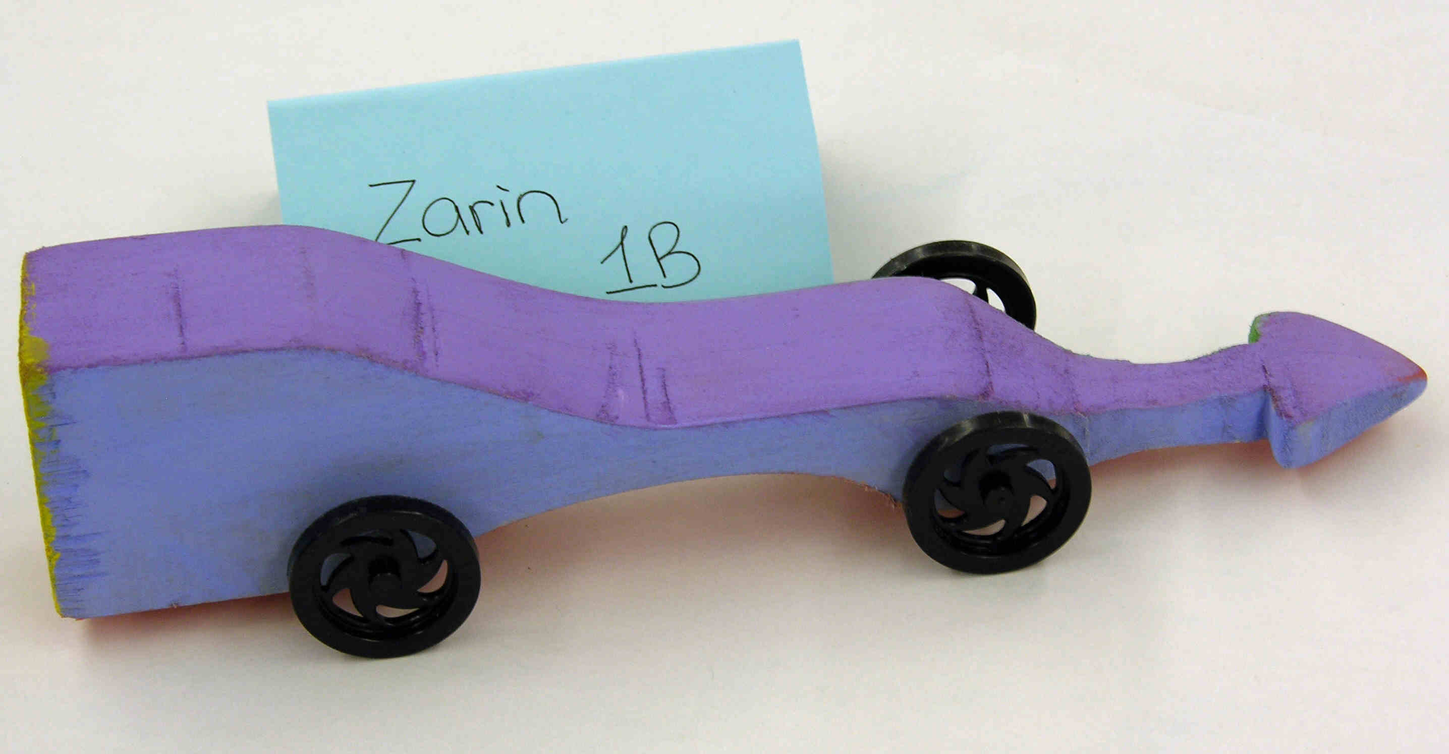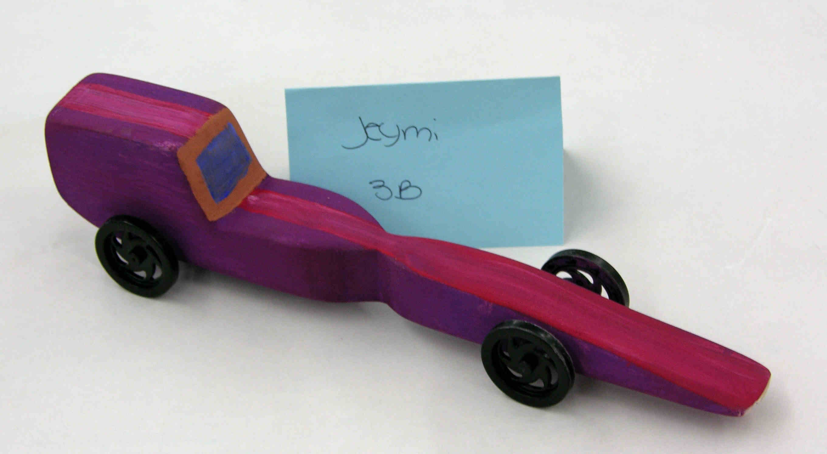 Students start by brainstorming for ideas incorporating aerodynamic designs. Then with a block of wood, they shape it,