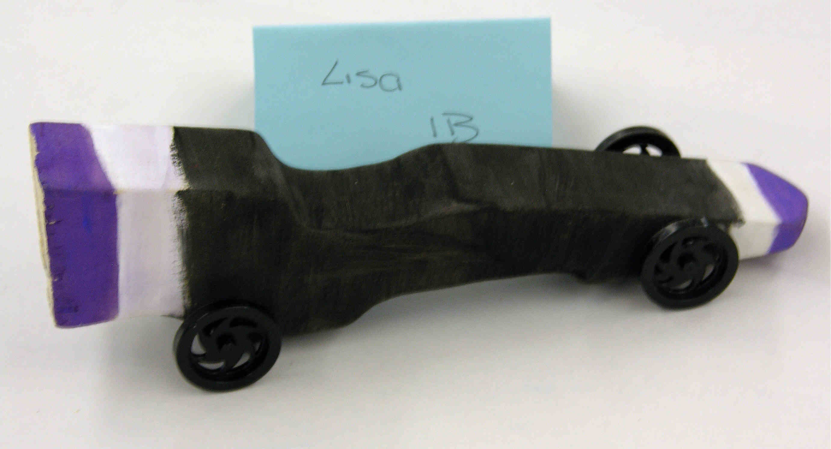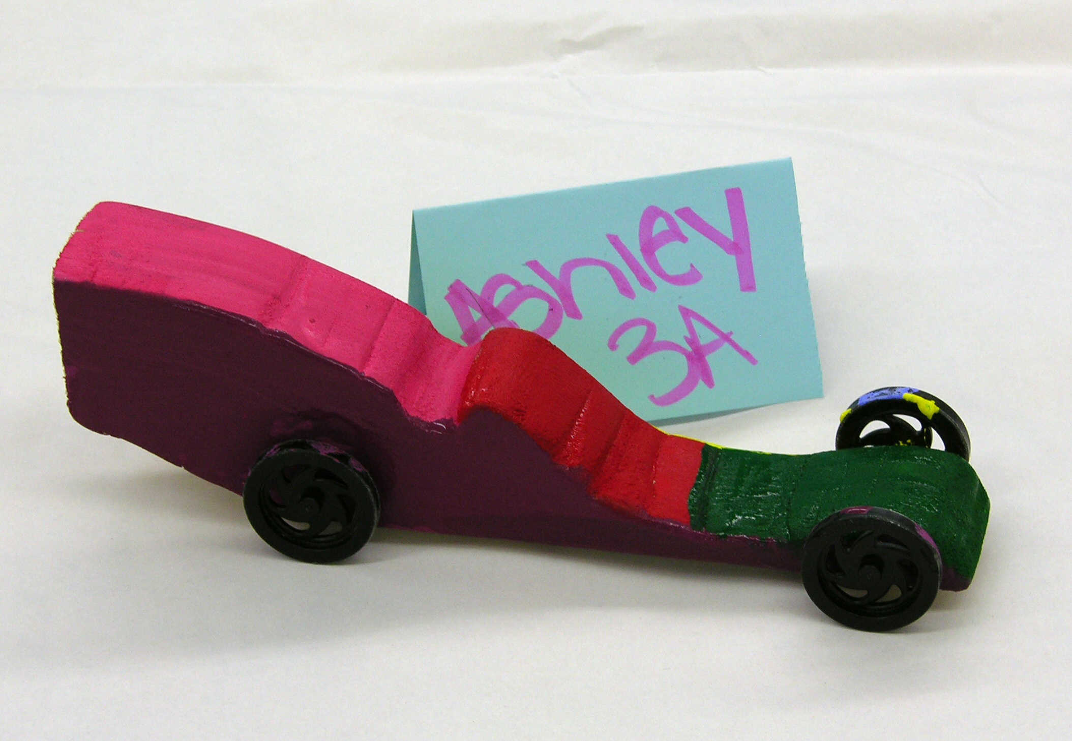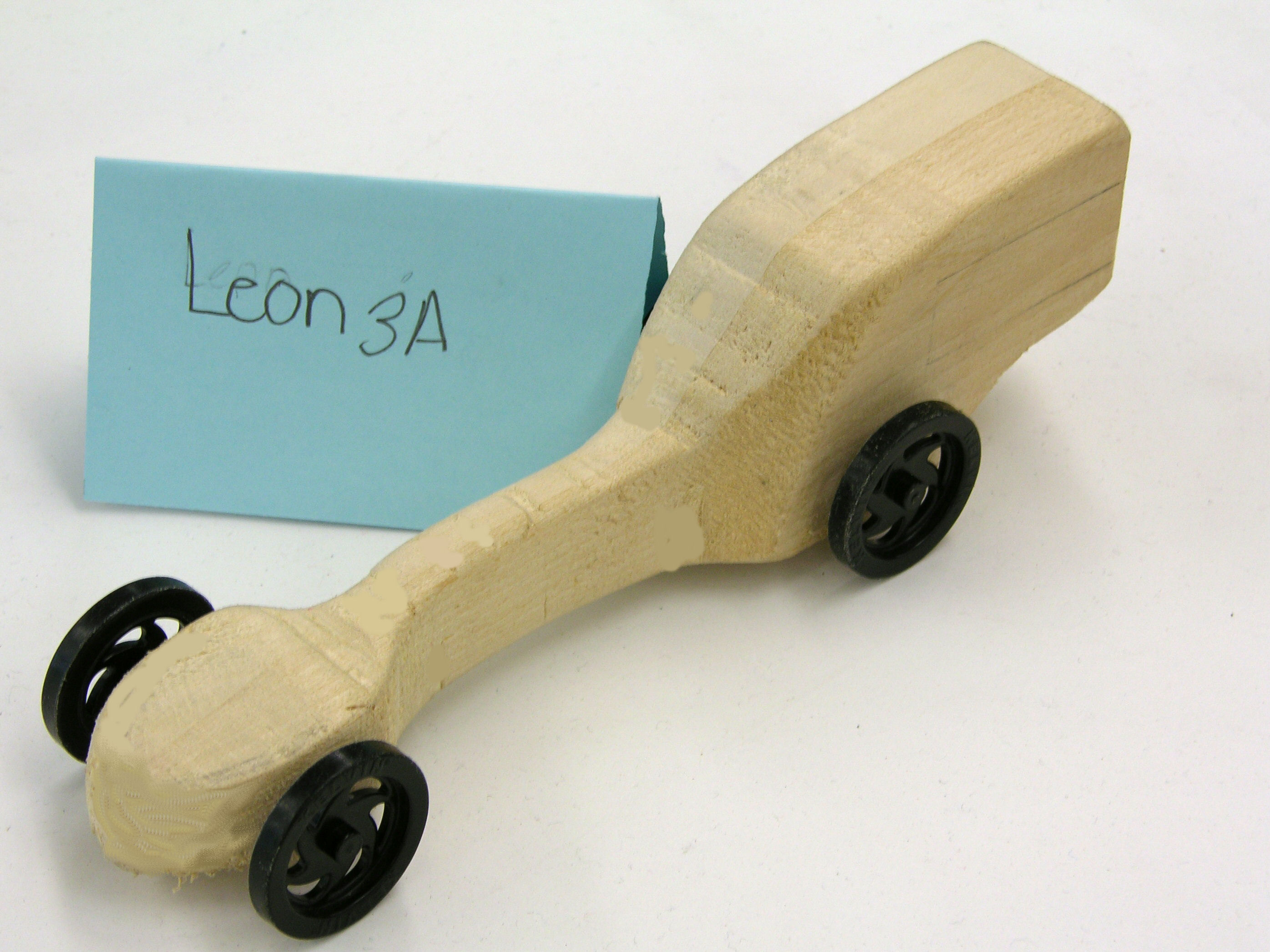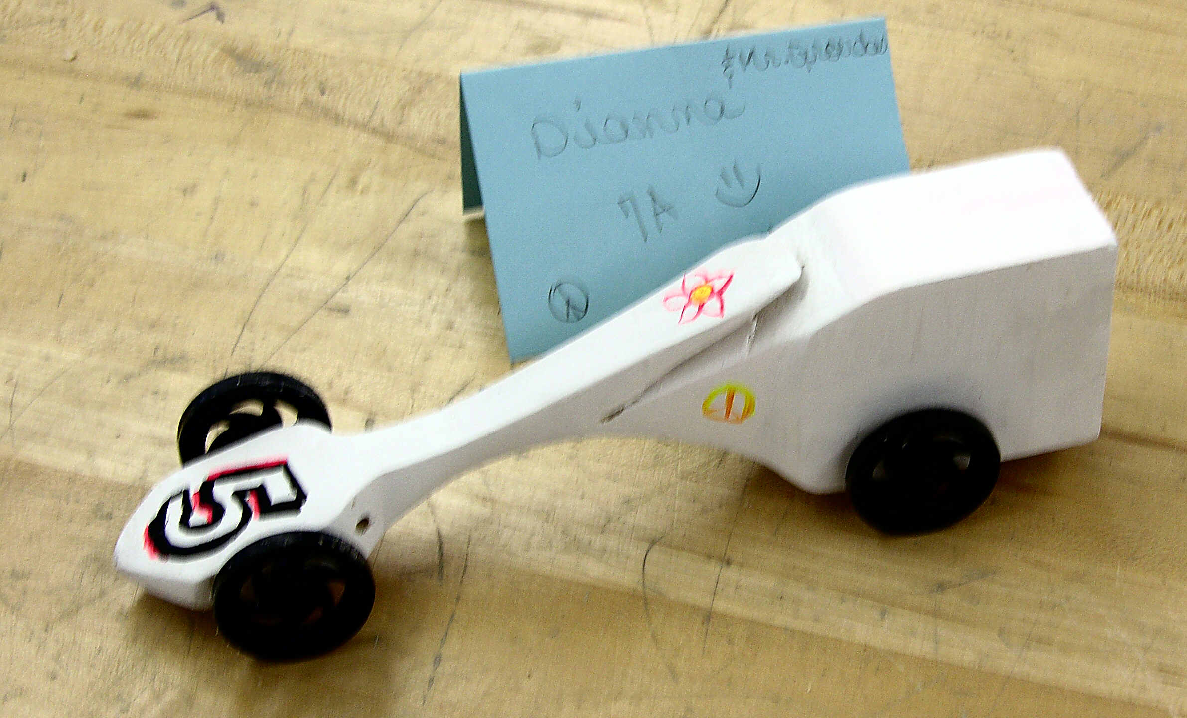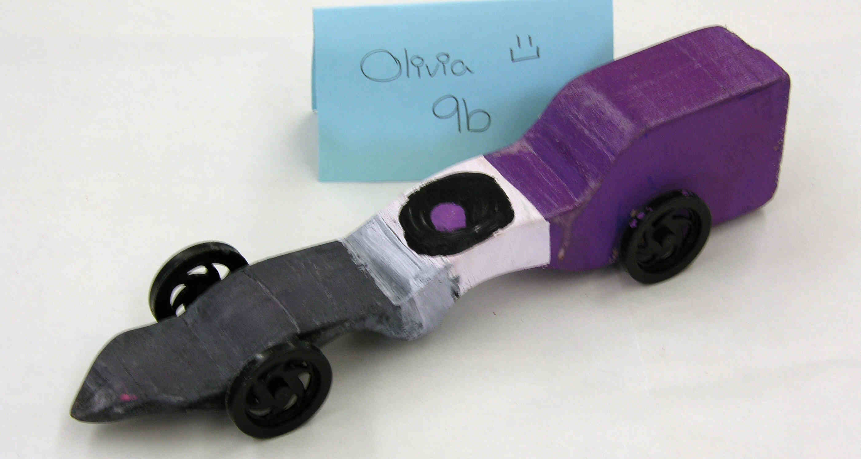 Students start by brainstorming for ideas incorporating aerodynamic designs. Then with a block of wood, they shape it,