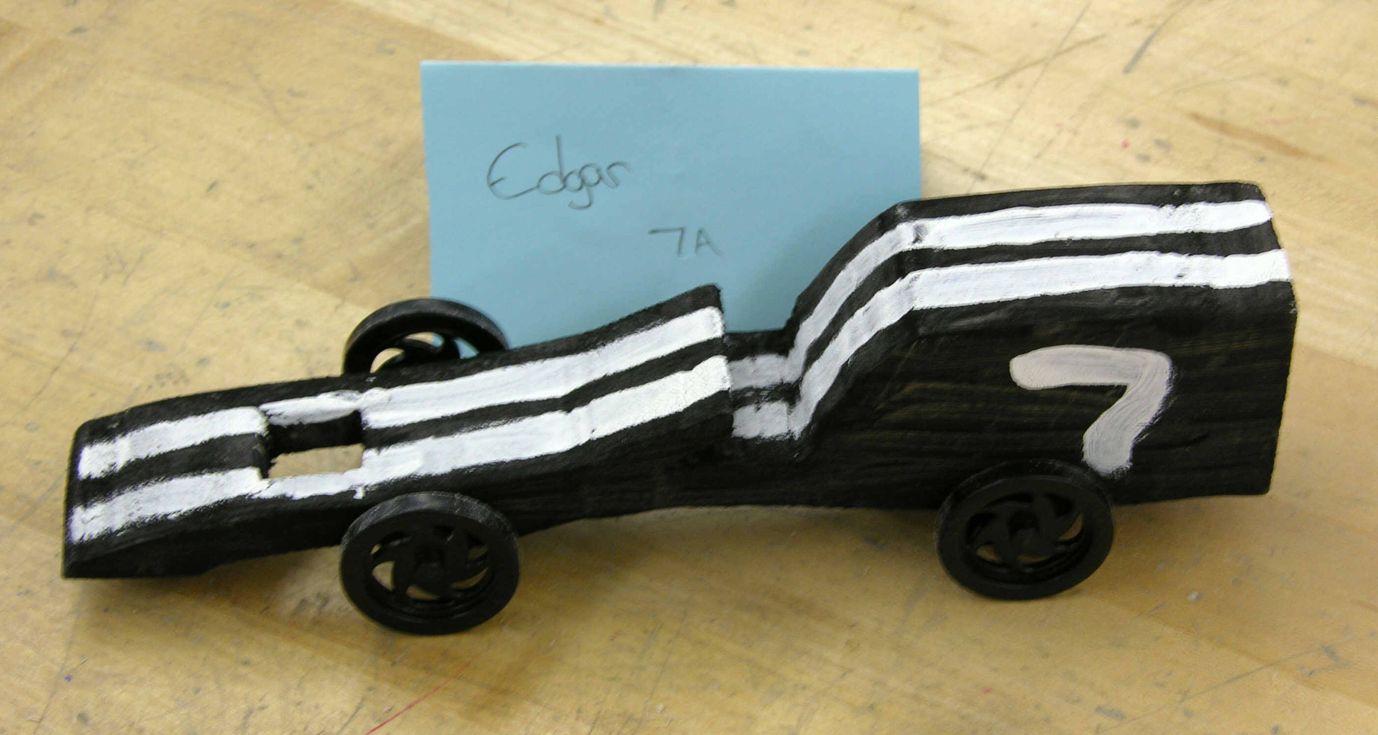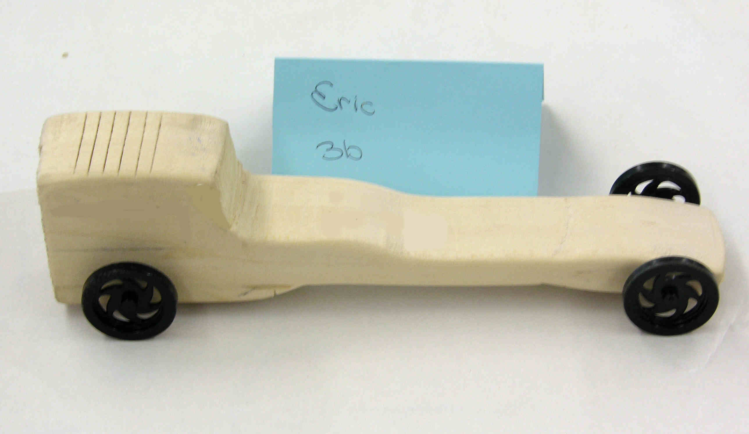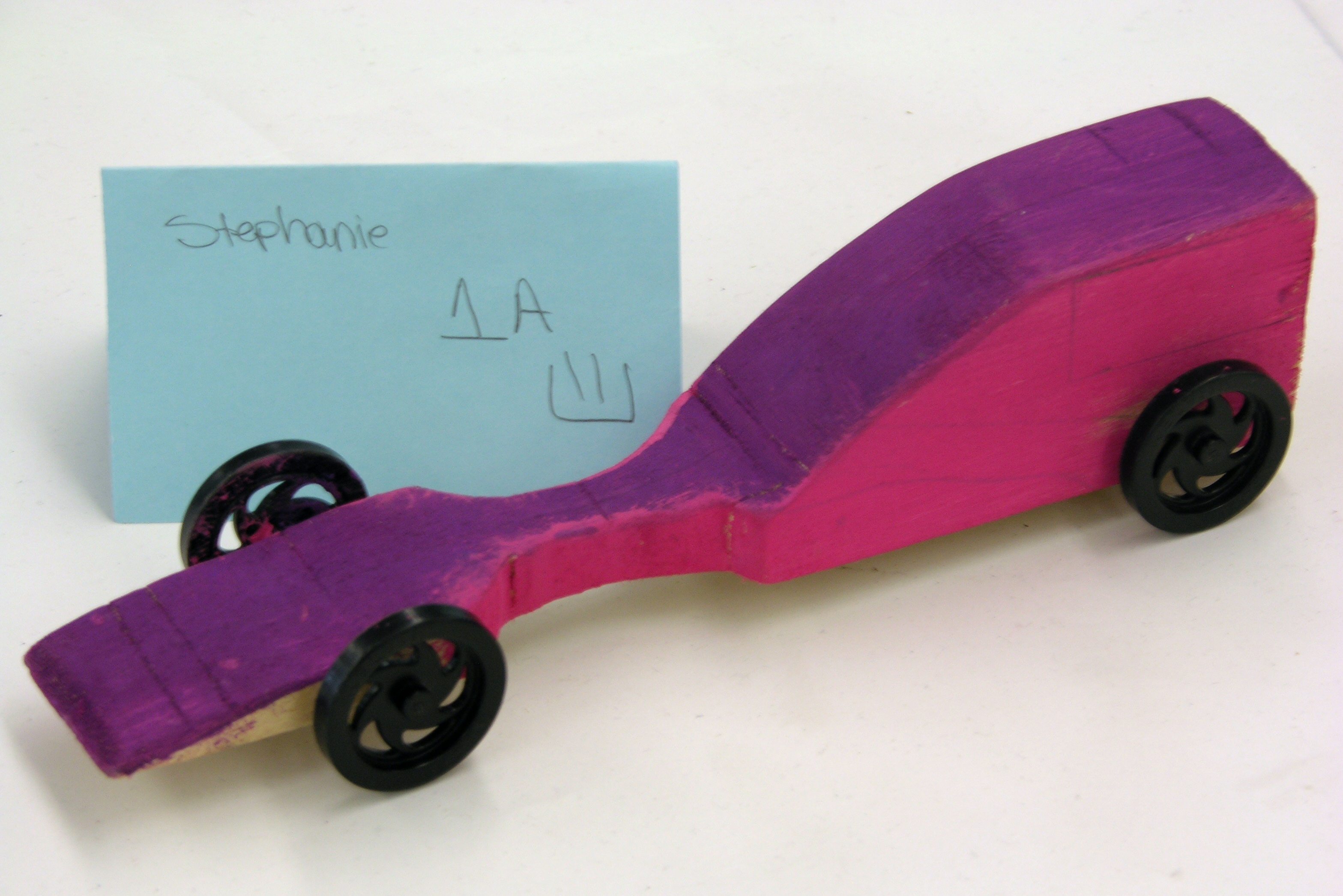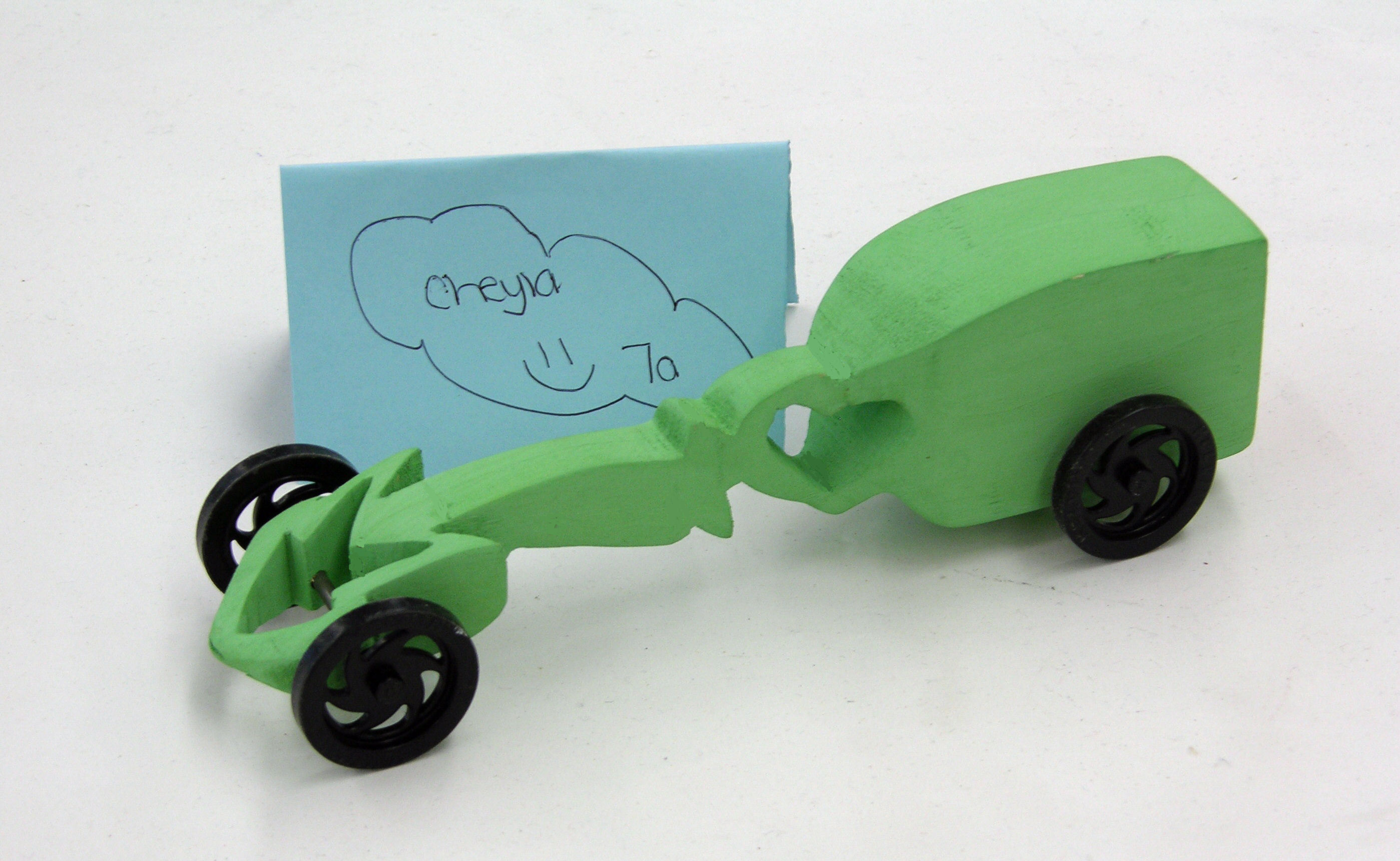 Students start by brainstorming for ideas incorporating aerodynamic designs. Then with a block of wood, they shape it,