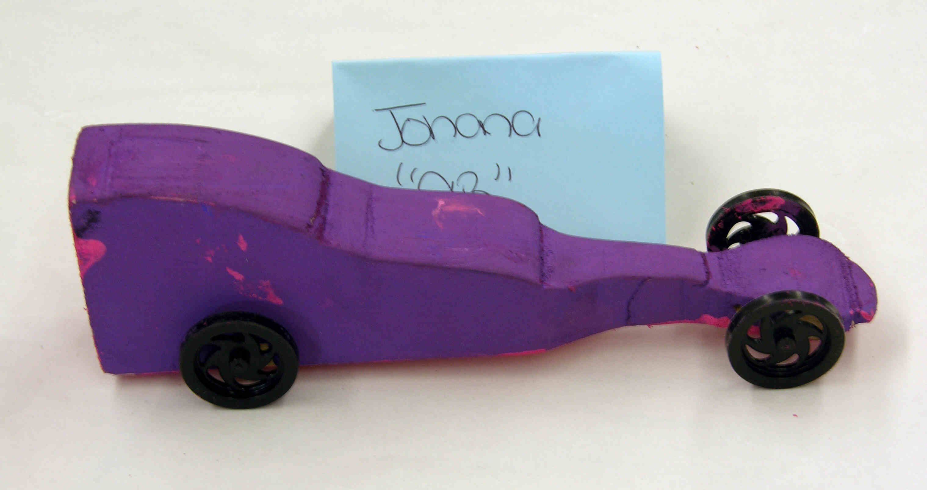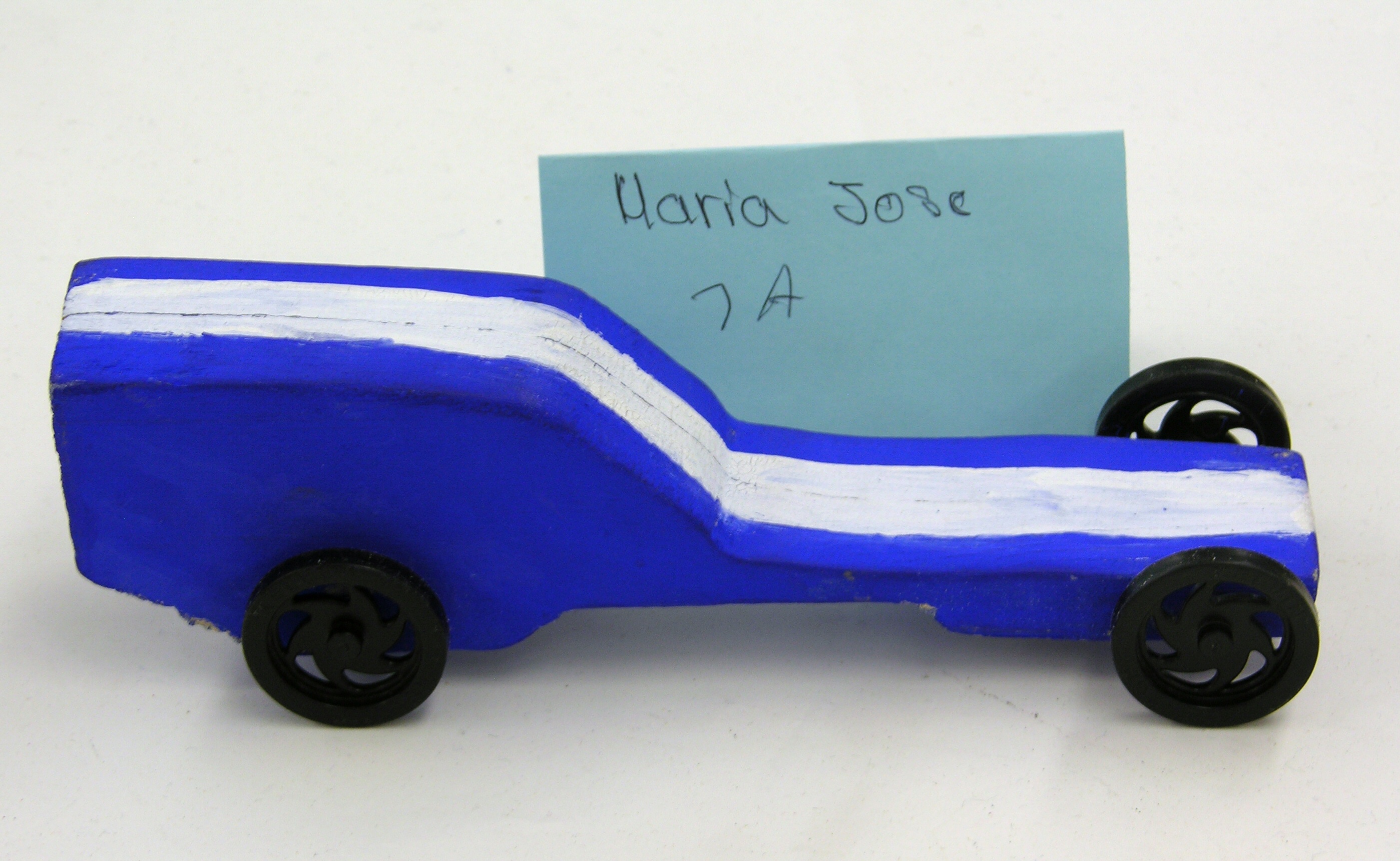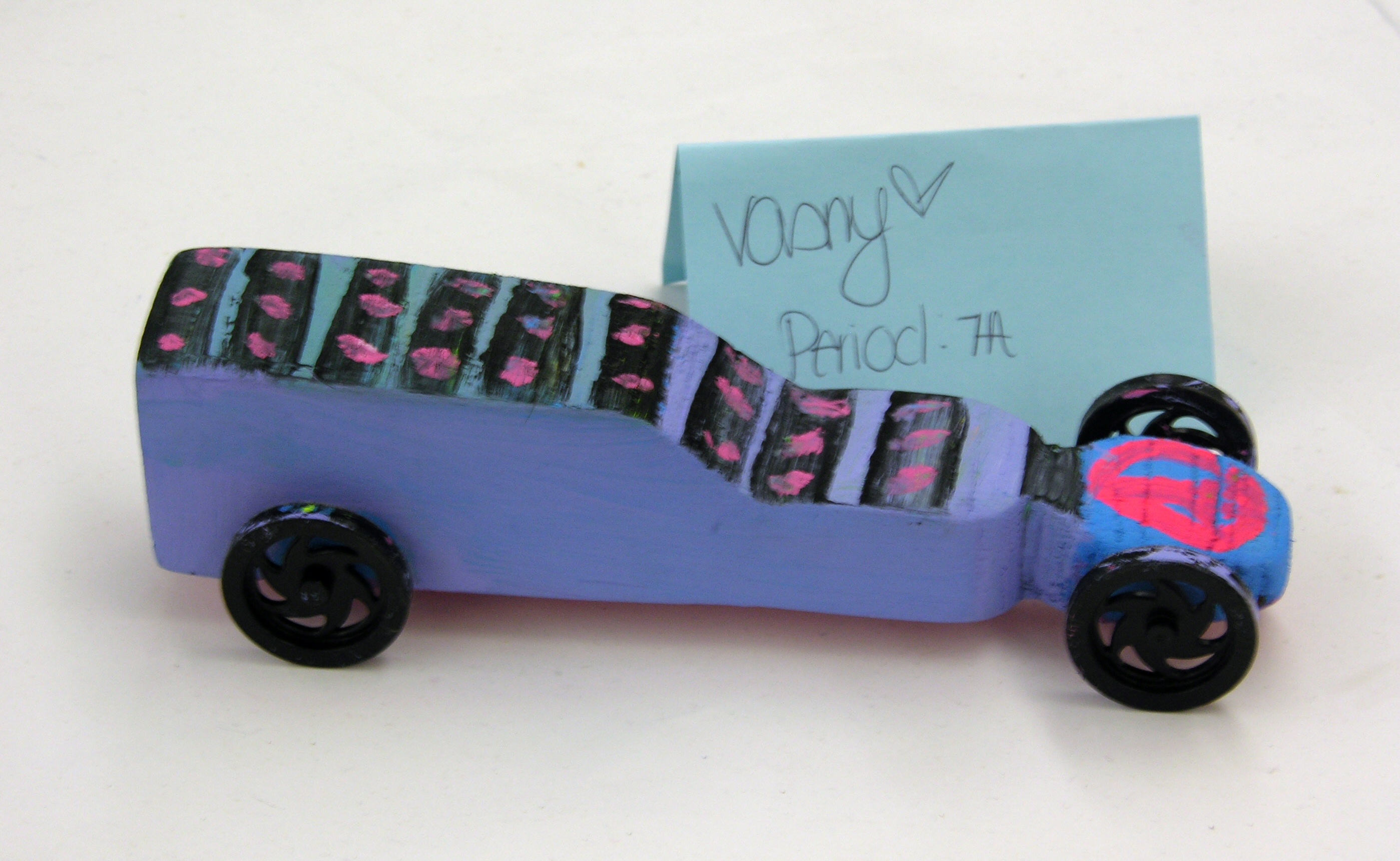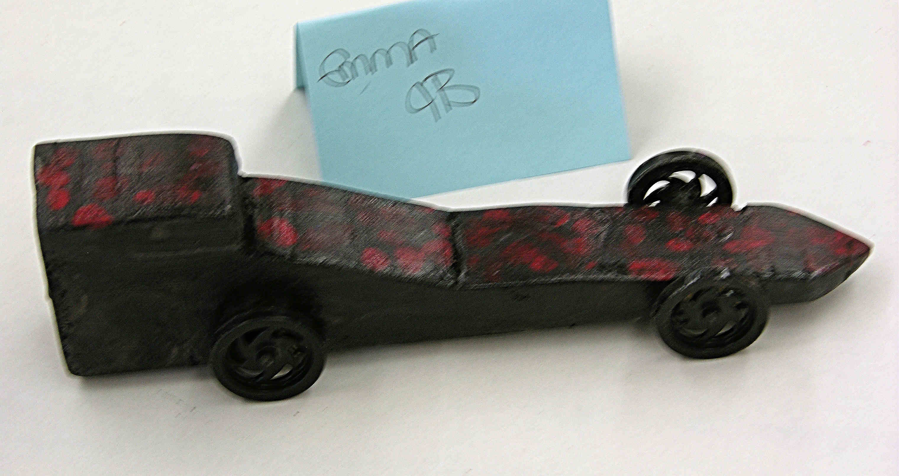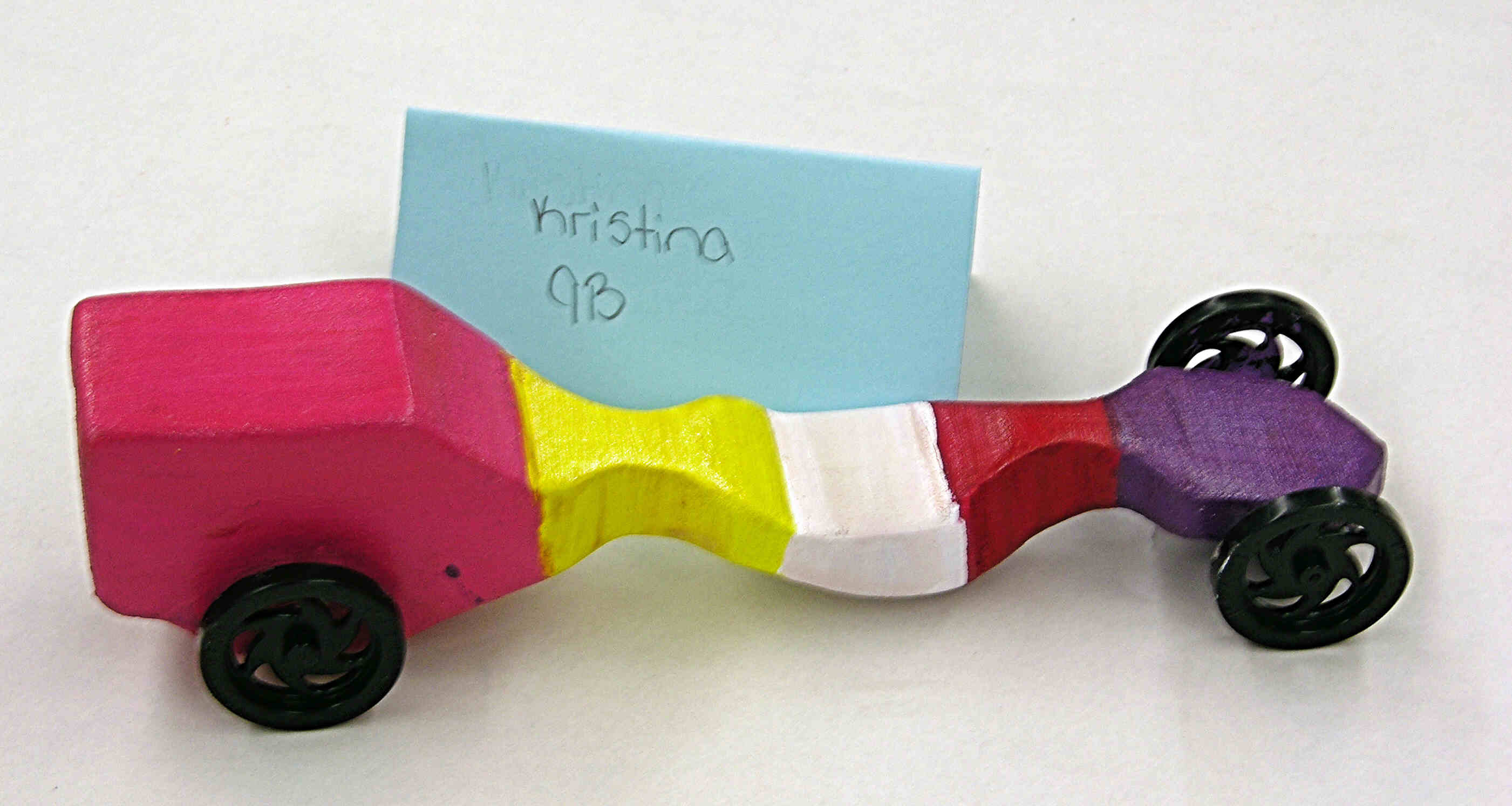 Students start by brainstorming for ideas incorporating aerodynamic designs. Then with a block of wood, they shape it,