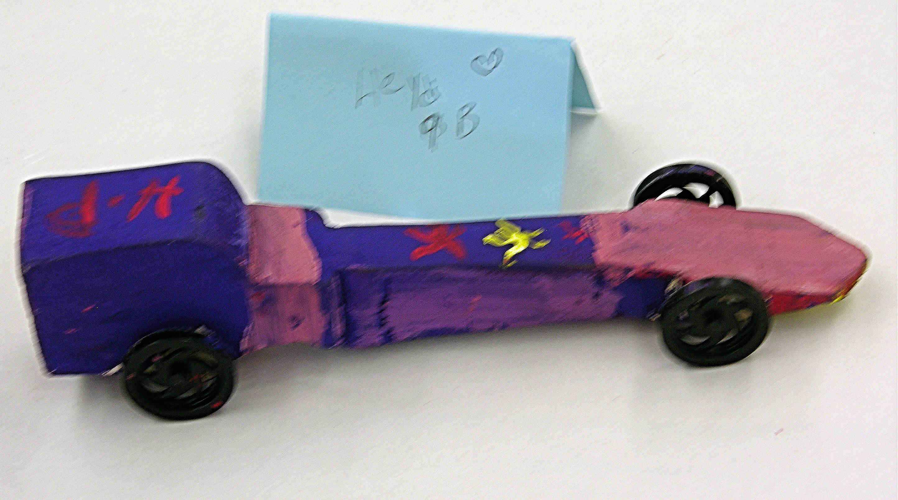 drill holes for axles and a CO2 cartridge, sand and polish dragster.